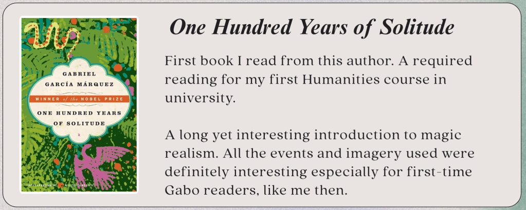 In my first Humanities class in university, one of our required readings was One Hundred Years of Solitude. Being a young 16-year-old at that time, I had never heard of this book and had to inquire at the nearest bookstore back home. Library access to fictional books wasn’t easy during that time and extremely limited, if there was even any. Searching for a copy of the book itself was a memorable experience.
