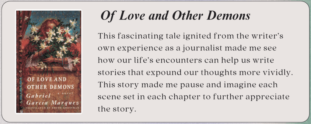 Even with a set expectation in my mind already, the first few lines from the first short story still shocked and amazed me. Can you imagine what it is like being in your rotting body way after your death? The lines from that young character in the first story, The Third Resignation, left me wanting to write as well as my favorite writers. I wished to share that sense of magic as well as touch my readers in an unexpected yet still relatable way. After all, that was how most of Marquez’s works affected me. However, I understand that strong writing skills develop through long hours of practice, writing, rewriting, and writing once more, along with extensive reading. Yes, reading! To read and be inspired, to read and be better, to read and further the span of worlds in your heart and mind.